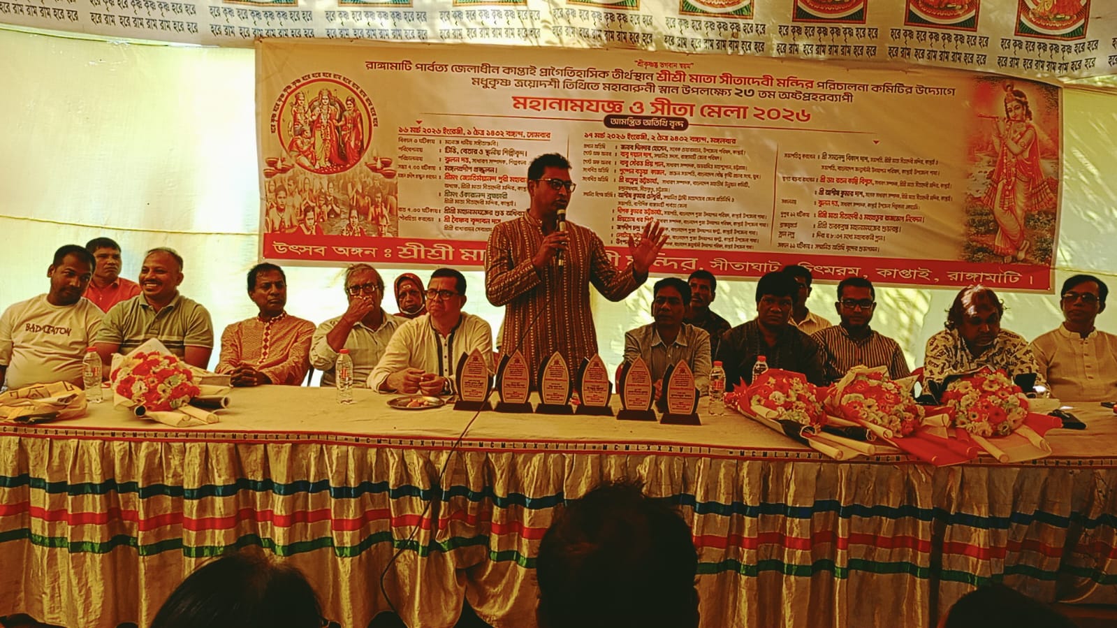 মন্দির পরিচালনা কমিটির সভাপতি সমলেন্দু বিকাশ দাশ এর সভাপতিত্বে কাপ্তাই প্রেসক্লাব ও উপজেলা শিল্পকলা একাডেমির সম্পাদক ঝুলন দত্তের সঞ্চালনায় এসময় গেস্ট অব অনার হিসেবে উপস্থিত ছিলেন রাঙামাটি জেলা পরিষদ সদস্য দয়াল দাশ। অনুষ্ঠানে সংবর্ধিত অতিথি হিসেবে উপস্থিত ছিলেন, বাংলাদেশ বৌদ্ধ কৃষ্টি প্রচার সংঘ, যুব এর প্রাক্তন সভাপতি পুস্পেন বড়ুয়া কাজল,